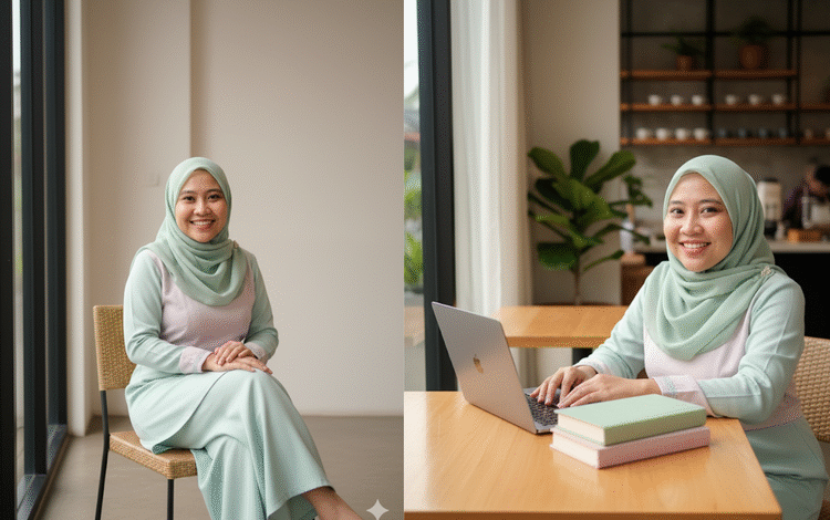 • Edit foto ini sehingga perempuan memakai blus pastel biru lilac dengan kerudung cokelat kopi serta rok putih panjang, duduk di kafe dengan ornamen laptop dan buku, tanpa mengubah wajah.